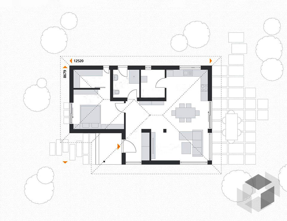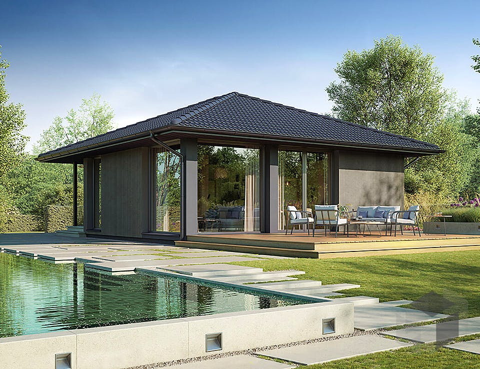 Moderna montažna kuća KS-109 je moderna, ali inspirisana tradicionalnom gradnjom sa svojim upečatljivim četvorovodnim krovom. Ovo nudi značajan prostor za skladištenje pod krovom za sve stvari koje su vam potrebne samo sezonski. Široki krovni prepust štiti fasadu od vremenskih nepogoda i istovremeno pruža dobru toplotnu zaštitu leti. Integrisana je velika ulazna nadstrešnica koja se oslanja na stub.