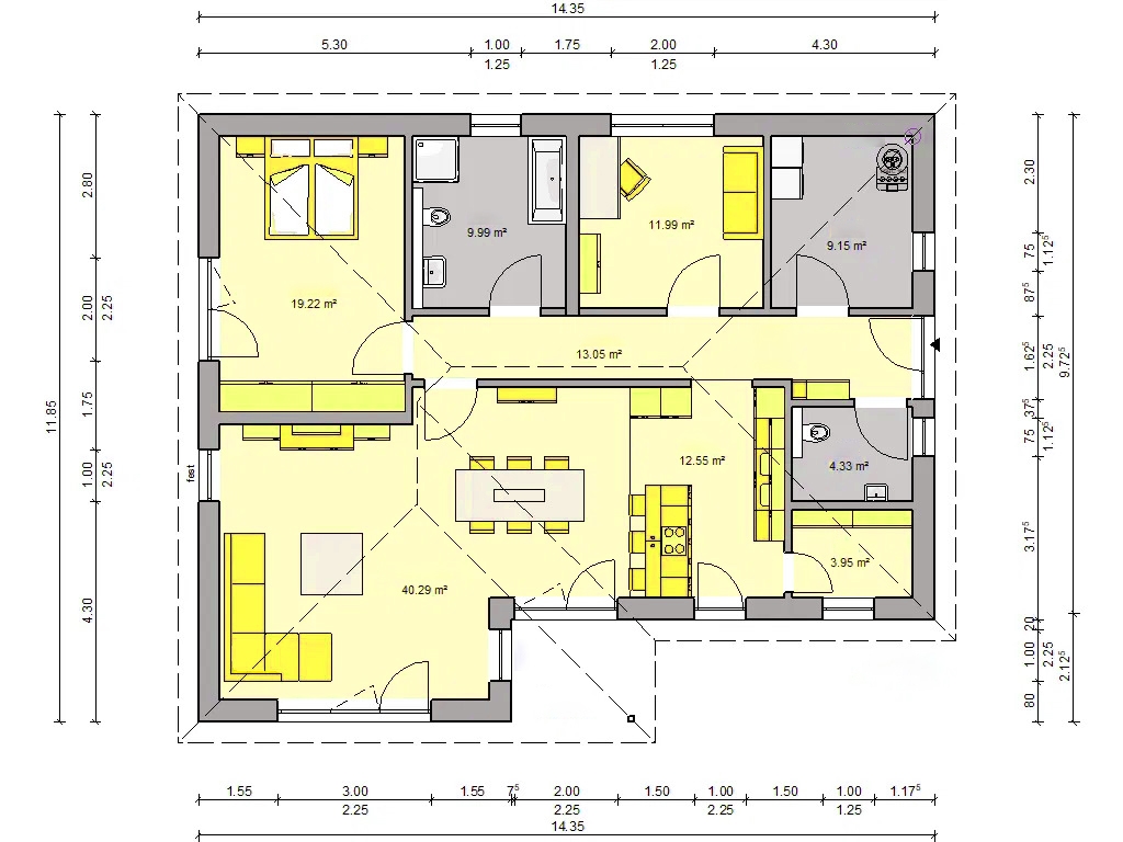 Savršena kuća za starije osobe da nastave zajednički život. U prizemlju se nalazi 124 m² stambenog prostora neto, odnosno 153,69 m² bruto za životni koncept prilagođen uzrastu. Ovde su sve sobe prostrane i lako dostupne. Posebno za dobra vremena u starosti, trebalo bi da se pobrinete za sebe i izgradite dom u kome se osećate prijatno. Ovaj model i plan omogućava život bez ikakvih prepreka.