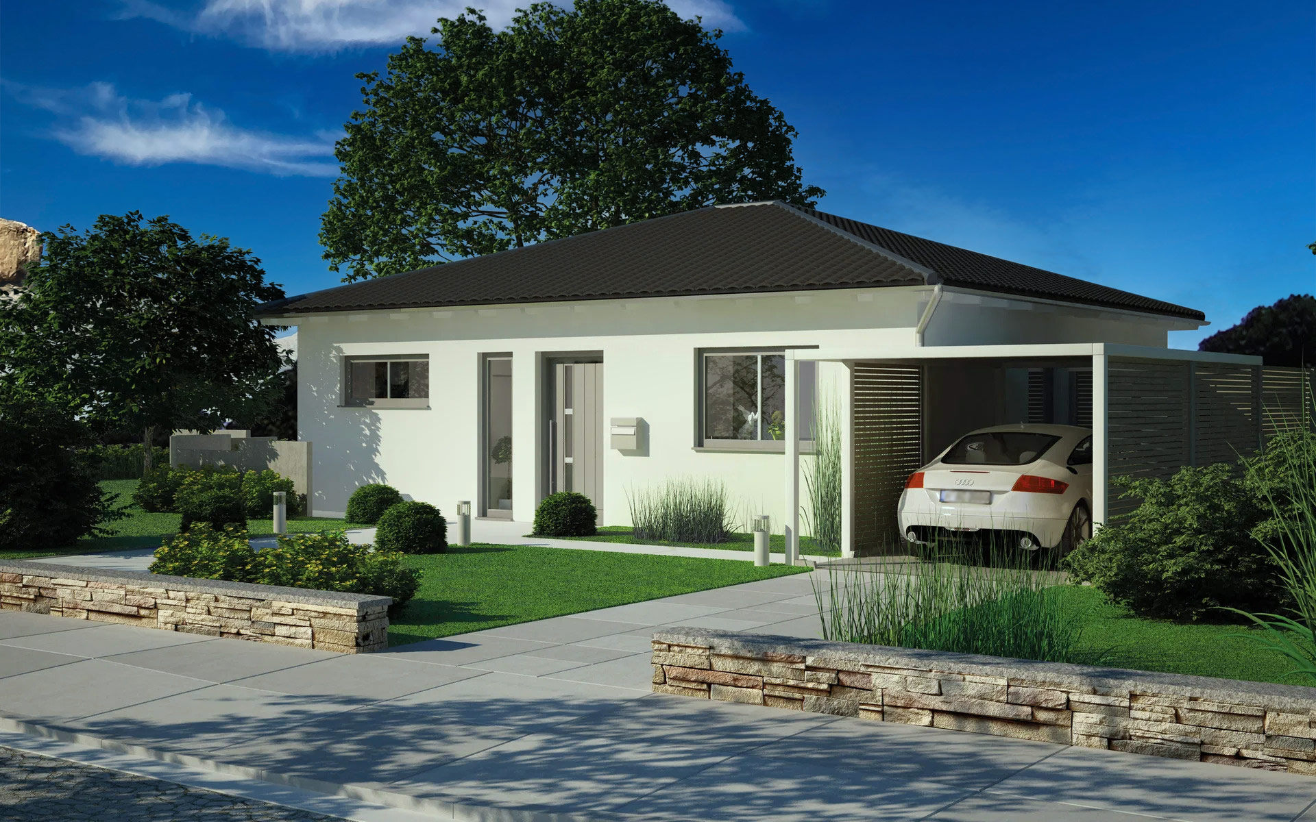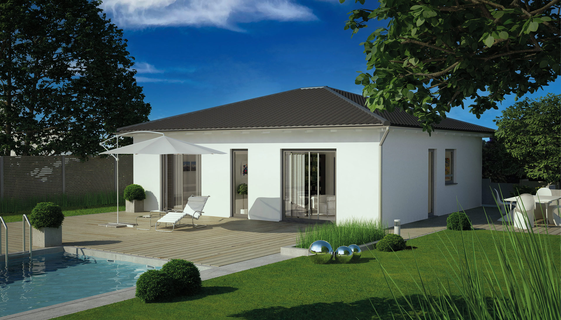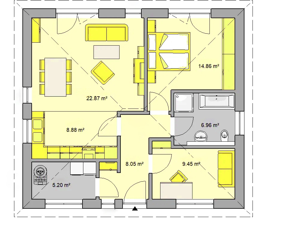 Sa 76 m² neto površine odnosno 96.77m2 bruto površine, stambenog prostora, Model KS-97 je jedan od manjih modernih projekata, ali vredi pogledati iza moderne spoljašnje fasade . Sa spoljašnje strane, mini-kuća impresionira kompaktnim četvorovodnim krovom i mnogim prozorima od poda do plafona koji puštaju mnogo svetlosti u sobe. Tako da se osećate veoma udobno u kući od prvog trenutka. Unutra, imate priliku da dizajnirate kuću onako kako ste je oduvek zamišljali. Otvoreni dnevni boravak da se osećate dobro, mala kuća, veliki uticaj – posebno u dnevnom delu, koji zajedno sa kuhinjom ima preko 30 m² i predstavlja srce kuće. Ovde ljudi kuvaju i jedu zajedno, jer je otvorena kuhinja direktno povezana sa trpezarijom. Kauč vas zatim poziva da provedete prijatno veče čitajući ili gledajući TV. U ovom delu kuće veliki fiksni prozorski elementi pozivaju vas da zavirite u baštu. Ovome se može pristupiti kroz dvokrilni prozor – tako da možete izaći napolje na nivou zemlje.